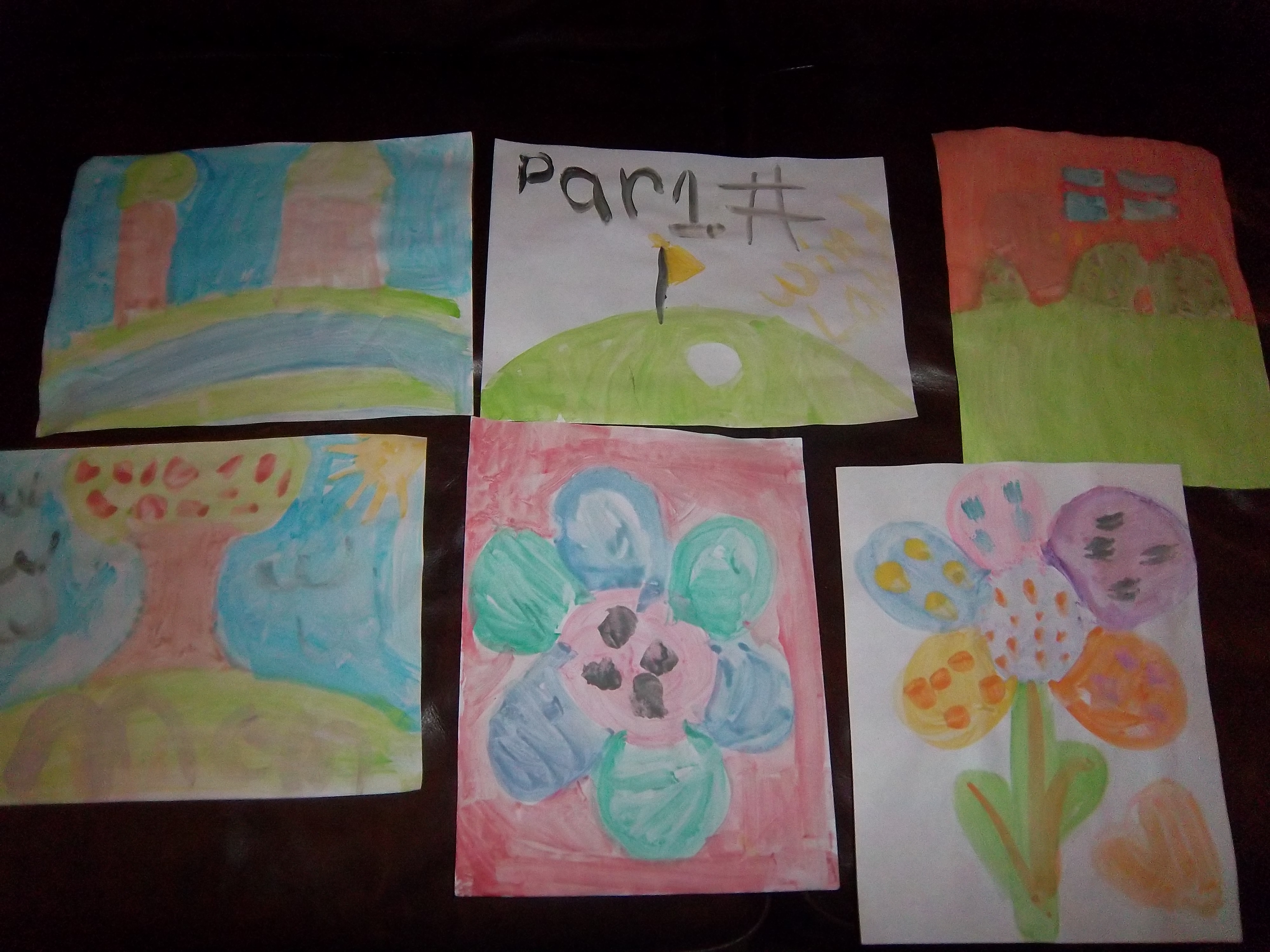 Even though we had a lot we wanted to get done this weekend, we still found time for naps on Saturday and Sunday.  Usually I end up taking about an hour and a half to two hours, and then I’m up, but for the first time in a while I took three hour naps both days.  Mark slept even longer.  Even Kayla (reportedly – with Kayla doing the reporting) slept two hours on Sunday.  At least we should be caught up on our rest!  Kayla used the time when we were napping and she wasn’t to paint pictures with watercolors for Mark and I.  Since I have the prerogatives of a proud parent, here is a photograph of her pictures: