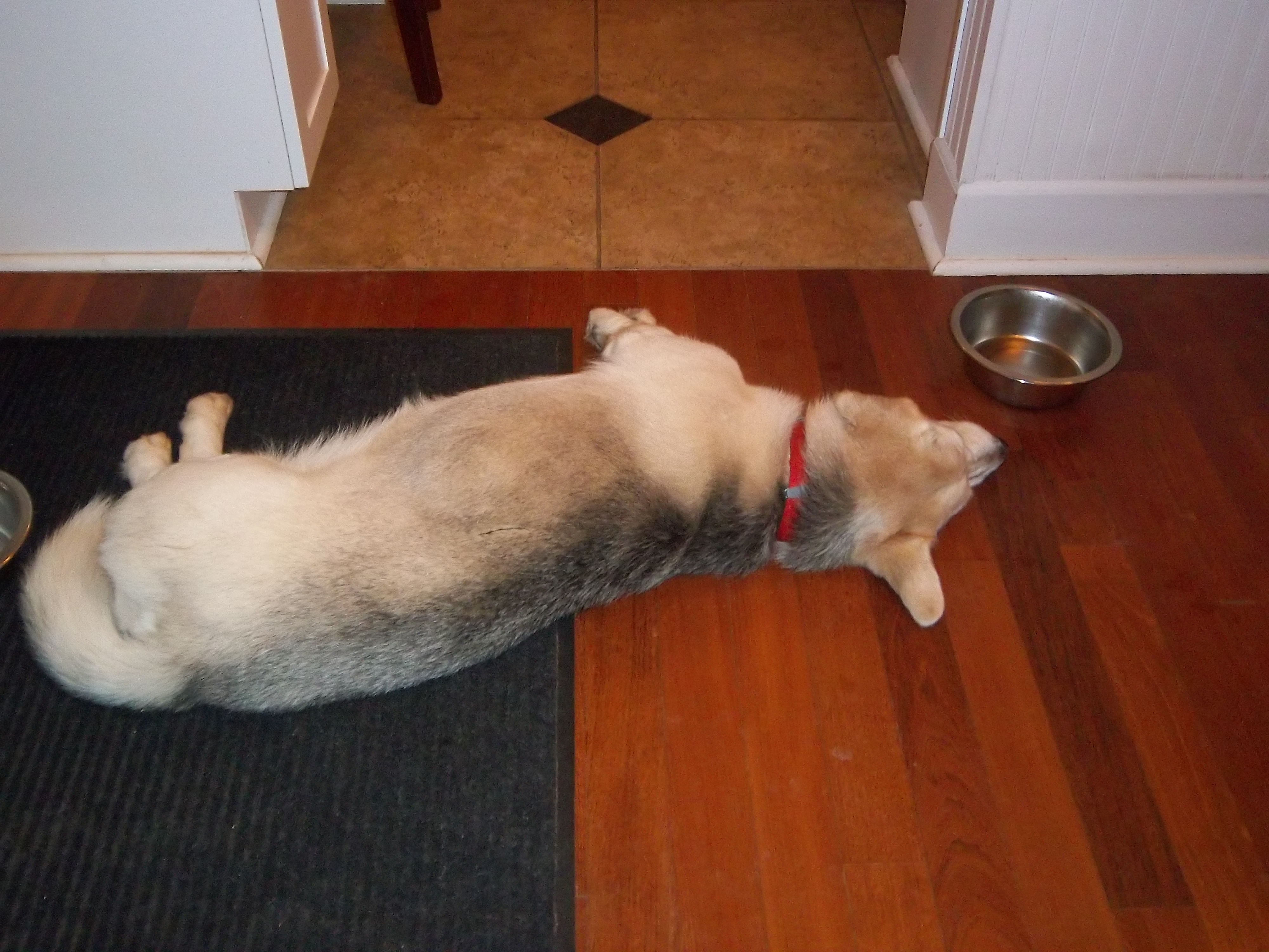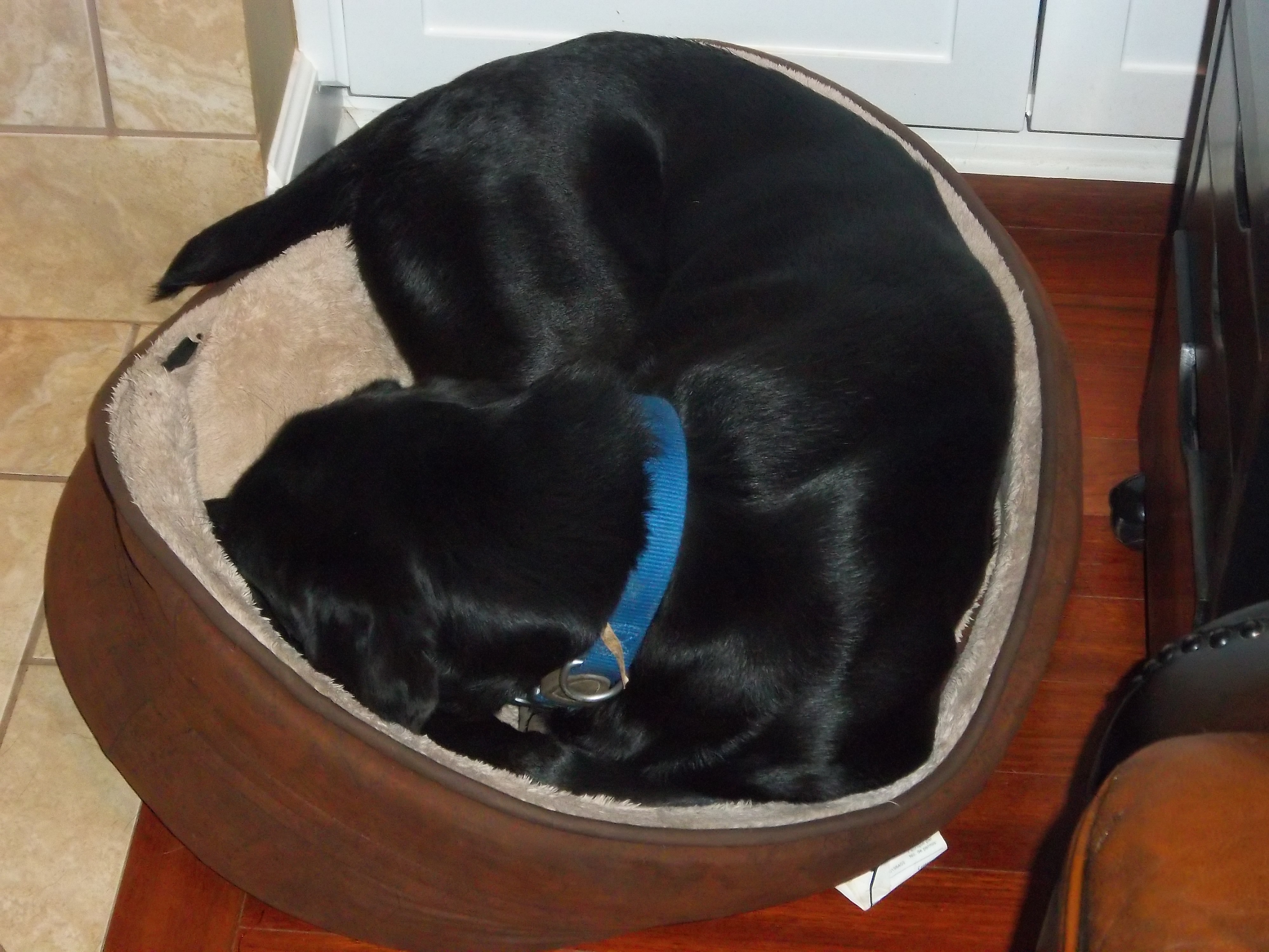 Darwin lying (well really for him I would say curled up) in the dog bed that it is too small for him but is his favorite: