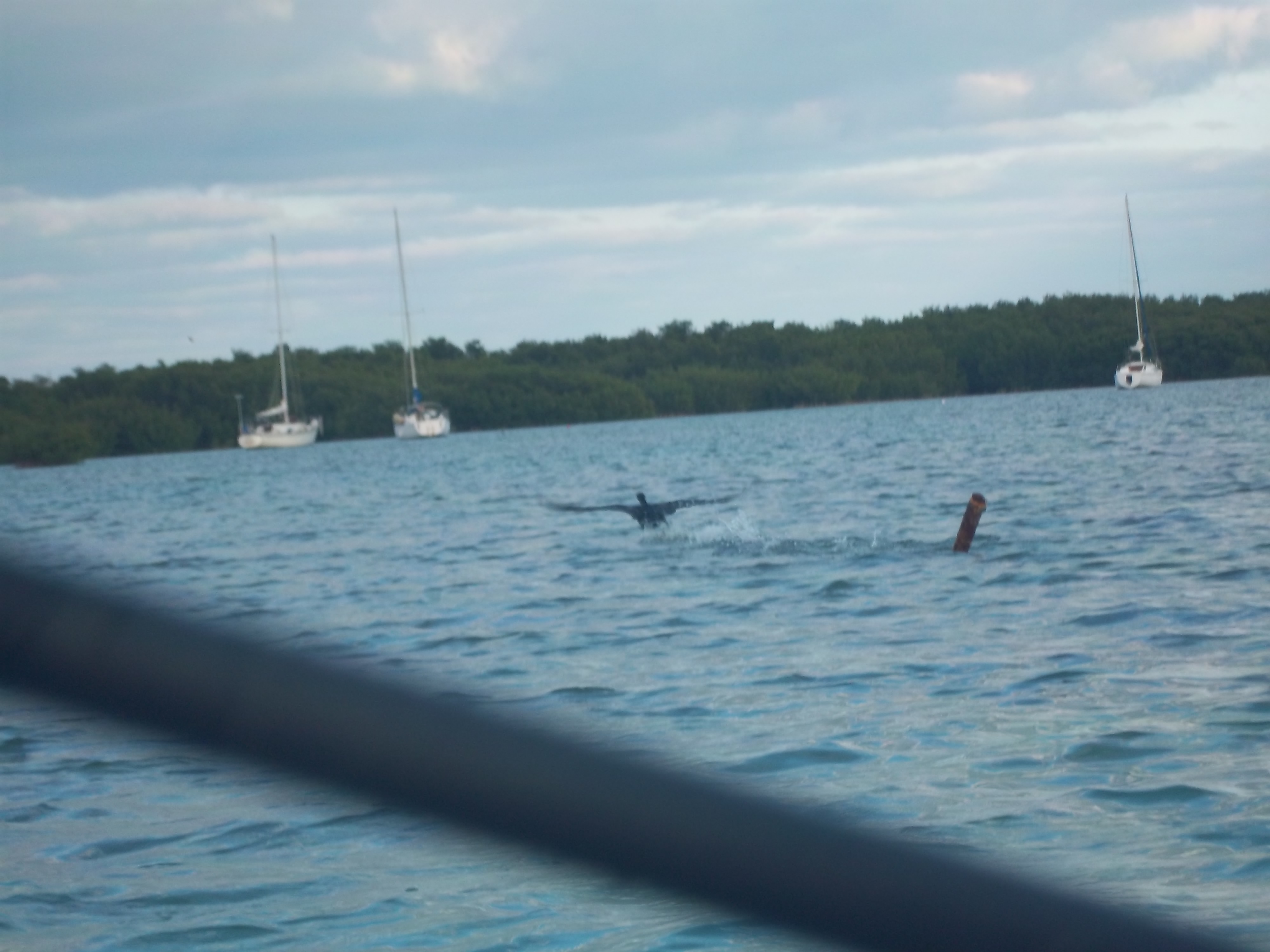Our destination was a group of mangrove islands in the middle of the bay, but on the way there we saw this black cormorant taking off. The cormorant is streamlined for swimming and diving, but the same adaptations that make it an excellent swimmer and diver make it somewhat ungainly in flight. We watched this cormorant for a while, and it never did get much over a foot above the water!