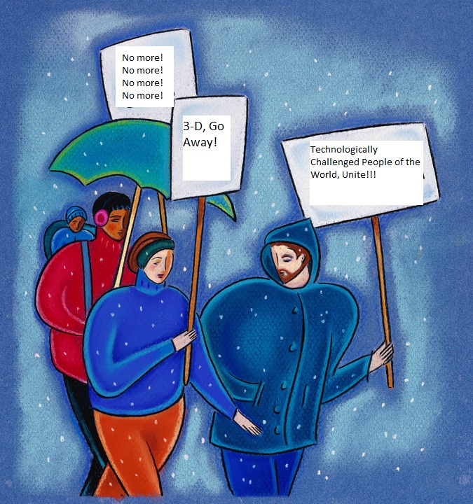 Now the DVD player companies are beginning to introduce DVD’s and televisions that can show movies and programs in 3-D.  Enough!  I have yet to see a 3-D movie that would be incomplete if I saw it in 2-D.  Let’s think for a minute people – isn’t being able to watch 100+ channels, download the movie of your choice from the internet or place your disc in the DVD player and watch it on your TV in super-duper high-clarity High-definition with surround sound comparable to that in a theater sufficient?  Do we really need something else to keep us glued to the TV and away from more profitable activities such as reading, writing or playing games?   I say no, and that it is high time for the technologically challenged people of the world to stand up and unite!