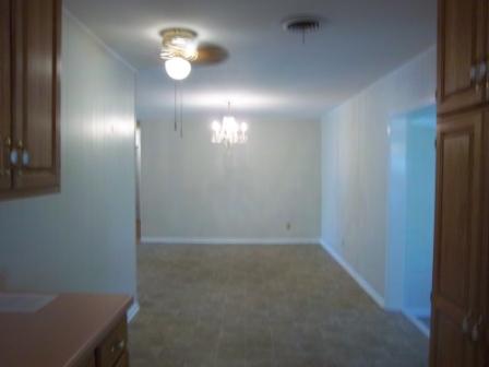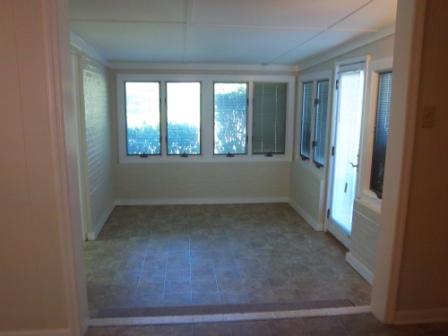 The wooden floored portion of the house gives way in the dining room to linoleum. This is a view of the dining room from the kitchen. In this picture, the living room would be just to the left of the dining room.