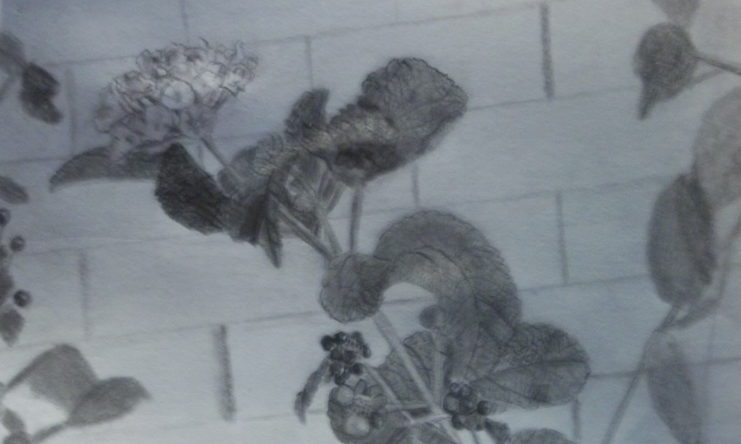 I reverted back to graphite pencil for my next challenge, a black and white rendering of a close-up of some Lantana we had growing against the white brick of the building I work in one summer.