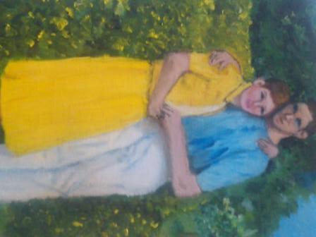 After that one, I did my first oil painting. Oil painting is very different from acrylic painting; oil paint dries very slowly and so can be put on the canvas in different ways. This painting was my attempt to make a color painting from a photograph of Grandma and Grandpa when they were young.