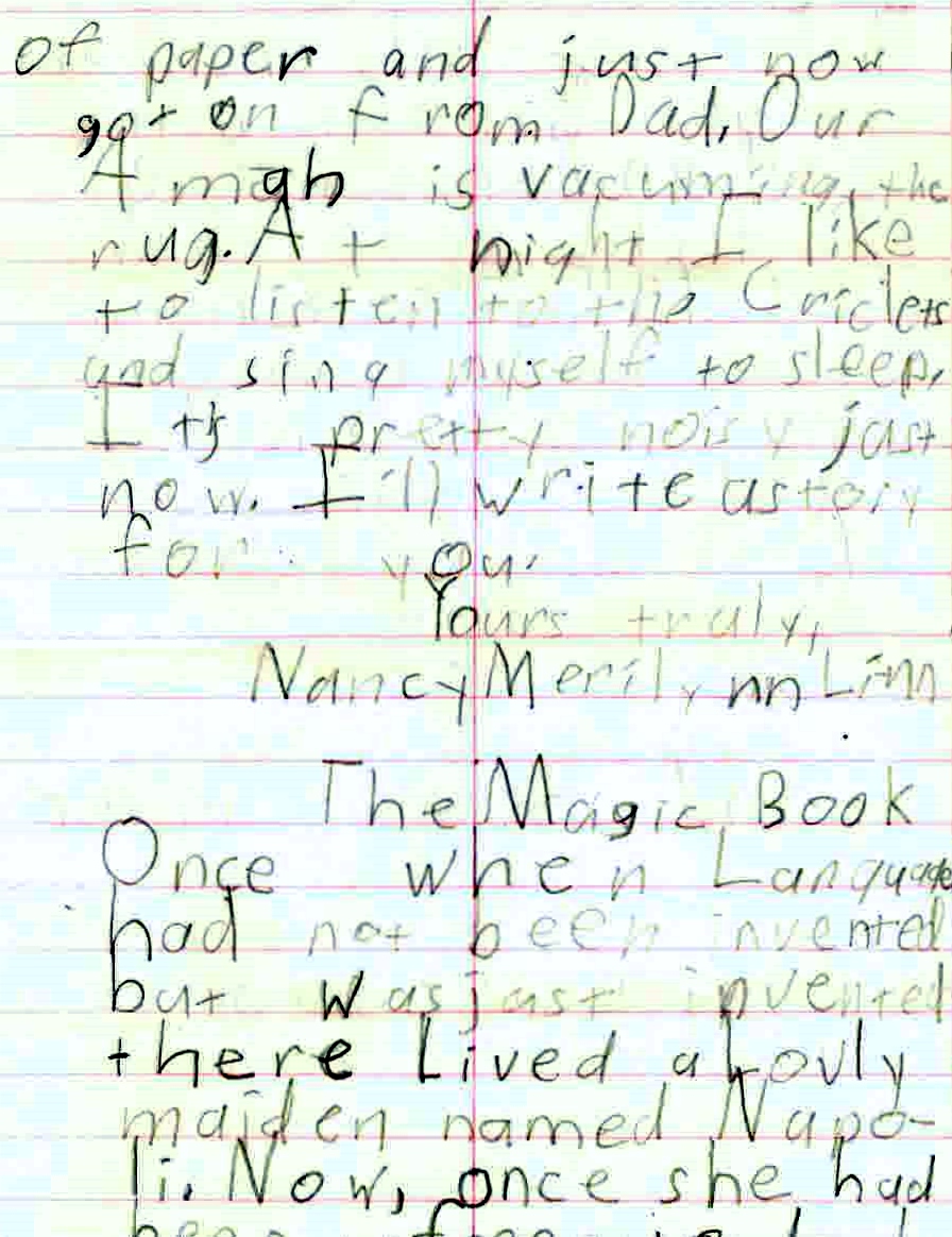 but a witch locked her up.  There was only one way to get her out of the cell and that was to find the book the Wisard of Os.”  Now a handsome prince came galloping along one day and every night came forth and Said “Come forth, Come forth please thee, Sweet Napoli.”