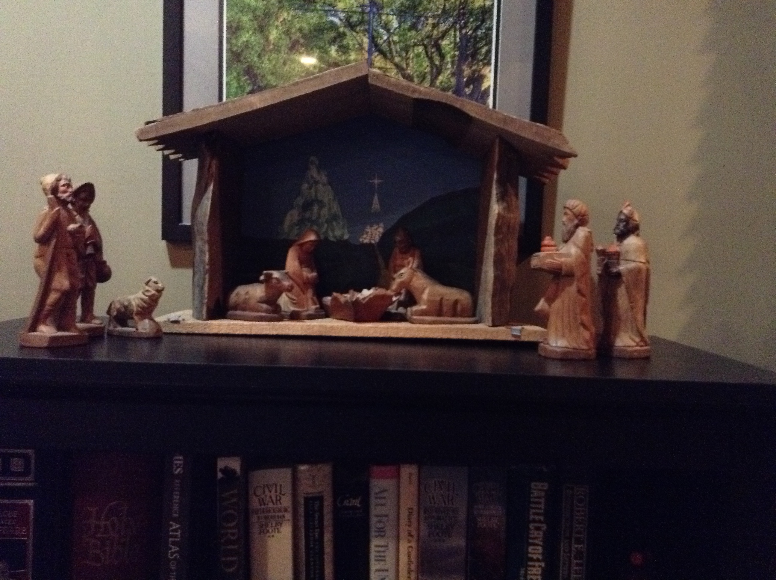 This is our family crèche, also known as our family manger scene. This is the first time in three Christmases that I have been able to put it up the way I like – the rental house we lived in for two years did not have a good place. It never feels quite like Christmas without the crèche up!