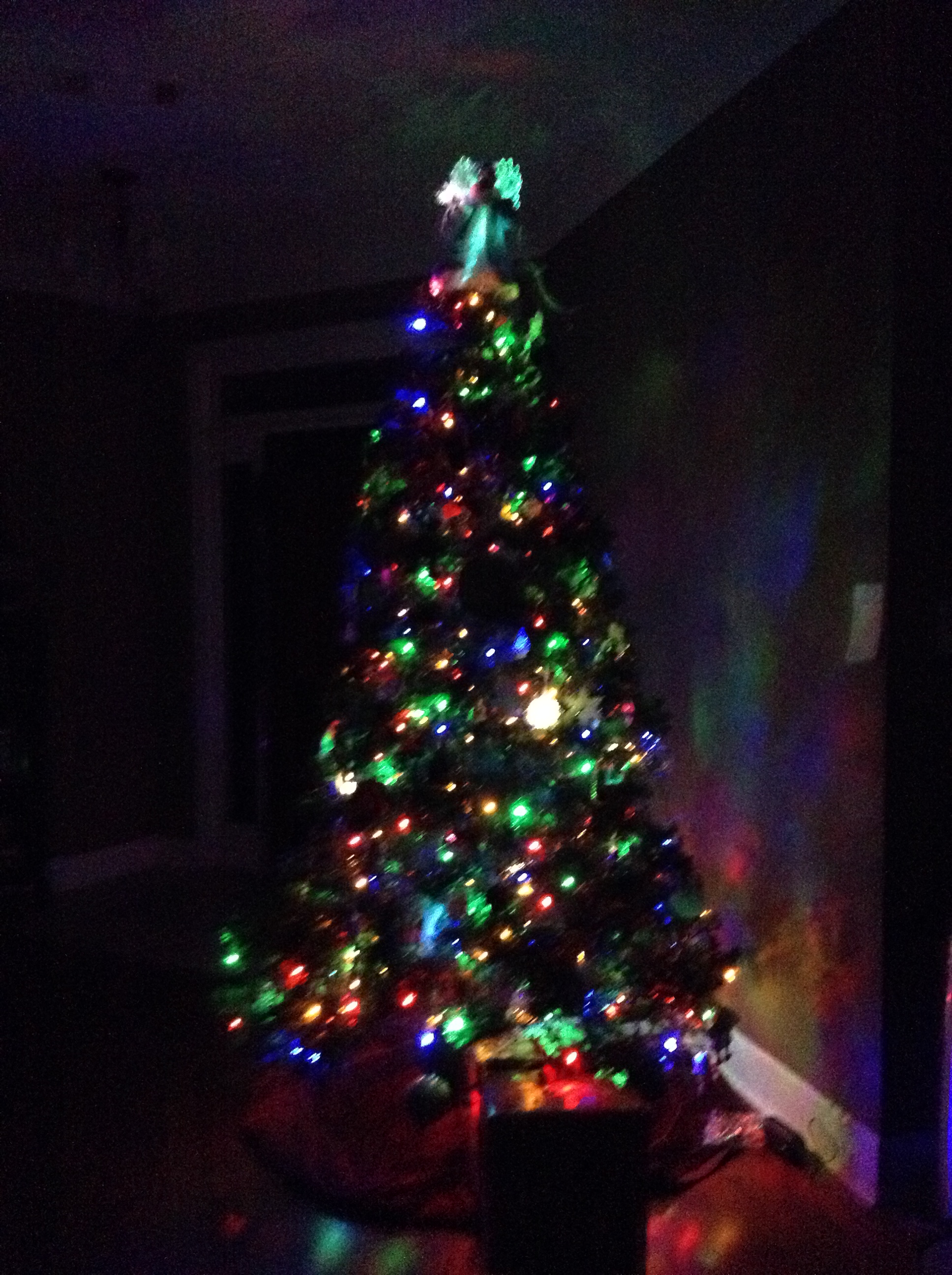 Mark is a white light Christmas person, and I am a colored light Christmas person. We thought never the twain should meet until we bought last year’s pre-wired artificial tree – it has a dual personality!