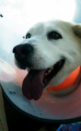 When they got to the store, Mark left Kayla in the car with the dog while he went in to PetSmart to get the cone, but after about five minutes sitting in the parking lot, Mandy let loose yet another giant shake of her head, causing the bandage to fly off her head, and the bleeding to start again, with the added bonus of copious drops of blood spattered all over the car, the dog and the daughter in the process. Kayla took Mandy out of the car after that to go find Mark, with the two of them dripping blood all over the local PetSmart.  After that, Mark took Mandy to the vet at the back of the PetSmart store and left her there to get sewn up, which we found out would include general anesthesia, stitches, injected antibiotics and pain killers and medicine to take home, automatically ensuring a Very Large Vet Bill.  The people there were very nice, professional and helpful, though.