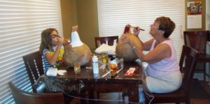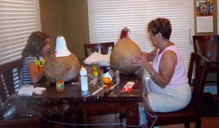 This weekend, my mom, who is visiting, Kayla and I had the chance to work on a craft project together. My mom brought up two huge gourds, which she had allowed to dry for over a year, which she wanted to paint; one is to be a Christmas decoration, painted like a Santa, and the other is to be a Halloween decoration.