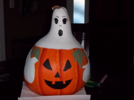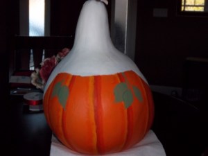 Mom finished the Santa gourd in Jacksonville, but she had brought the other gourd back up here with her. She was going to finish it while she was here, but since she is making the Rapunzel costume for Kayla, which, by the way, is going to be gorgeous, she won’t have time. So yesterday, I took over the task of starting to finish the pumpkin gourd. I have some more detail work to do, but when I put my brushes up at 5:00 p.m yesterday, the pumpkin gourd was starting to shape up.