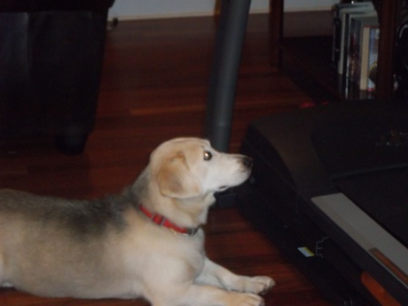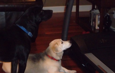Once Mark and she got it put together, it was time to try it out, briefly. Each of us spent about two minutes on it, just to see if it worked. What we didn’t expect was the dogs’ reaction to it. Tyra ignored it, but Mandy was mesmerized, and Darwin, unwilling to let his twin enjoy something without him, decided he would be mesmerized, too. I thought maybe it was just a one day thing, but this morning, when Mark got up early to use the treadmill, the two dogs camped out by the treadmill yet again.