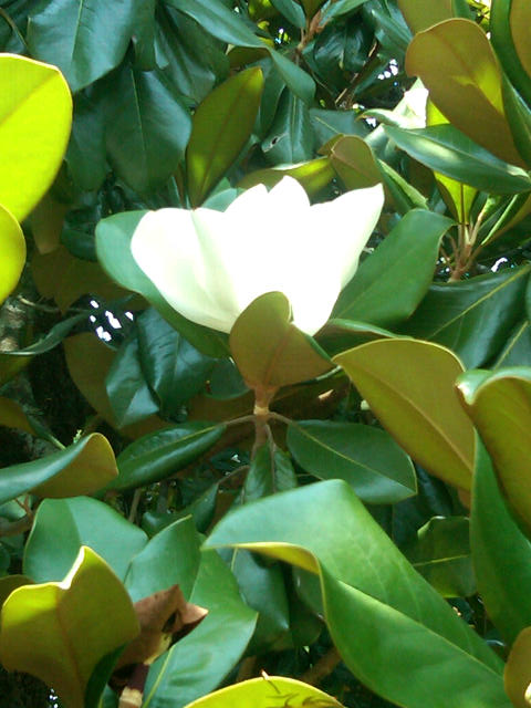 Although this tree was not in full flower, there were some blooms. This flower was about mid-way up the tree and as I snapped the picture, the sun came out from behind the clouds, making the leaves and the flower luminous.