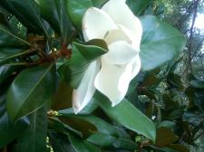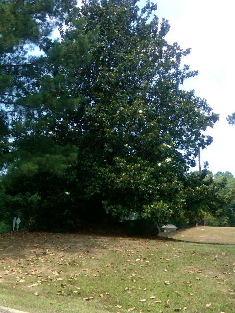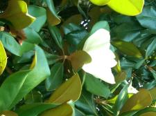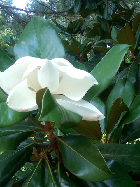 The next tree is the stately magnolia. I like magnolias. They get around: their natural range is east and southeast Asia, eastern North America, Central America, the West Indies and South America! When you see a magnolia, no matter how hot it is at that moment, you feel just a little bit cooler. The foliage is a smooth dark green, and the white flowers are unsurpassed. I have even, in years past, picked up a few silk magnolia flowers at Christmas time to place on the Christmas tree and they were stunning. Since the magnolias appeared before bees did, their flowers are designed to be pollinated by beetles, and therefore are more hardy than other flowers. I found a pretty specimen out in the City Sportplex, by Kayla’s day camp, and got a chance to take some pictures.